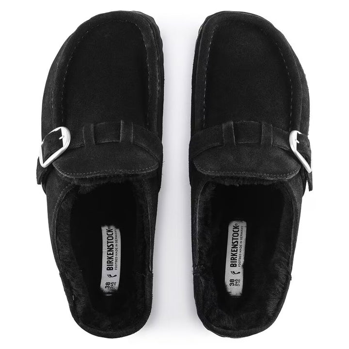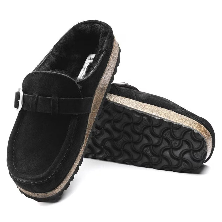 BIRKENSTOCK Buckley è un sabot semiaperto in stile mocassino, un vero originale BIRKENSTOCK immediatamente riconoscibile dall’ampia suola in sughero. L’appariscente cucitura è una vera chicca. Questo classico si mostra qui in una variante particolarmente comoda con pelliccia di agnello e con il nostro amato Big Buckle. La scarpa ideale per le serate invernali al calduccio davanti al camino! La tomaia contribuisce a ricreare un design naturale grazie alla pelle scamosciata particolarmente morbida che aderisce al piede come una seconda pelle.